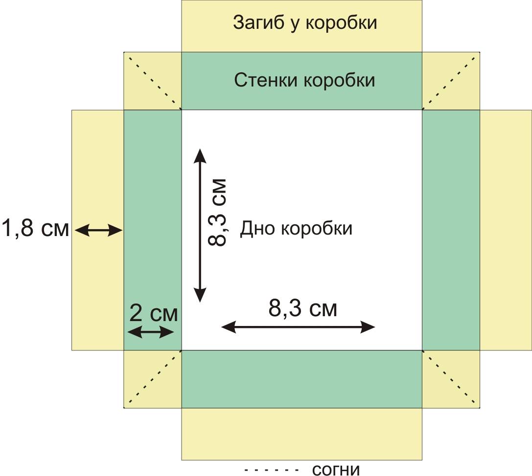 - Точно так же вырезаем, загибаем линии. Помнете маленькие квадратики по углам? Вот их нужно сложить по диагонали пополам. Загнуть все края и загибы крышки, проклеив каждый участок клеем ПВА.