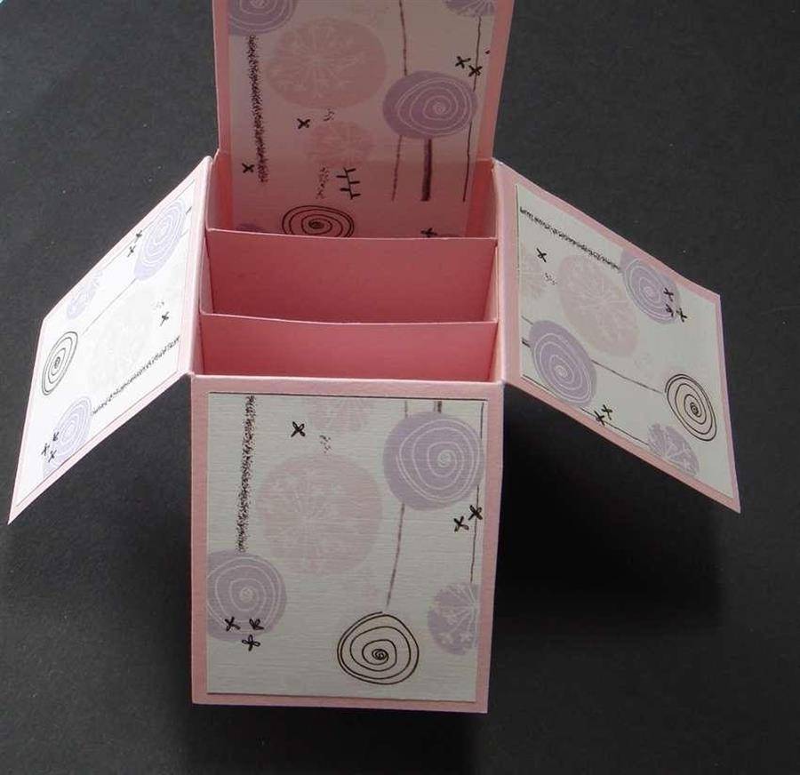 Коробочка не будет склеена по краям. Она будет держаться за счет крышки сверху. При открывании крышки стены коробки будут распадаться, показывая сюрприз, находящийся внутри.