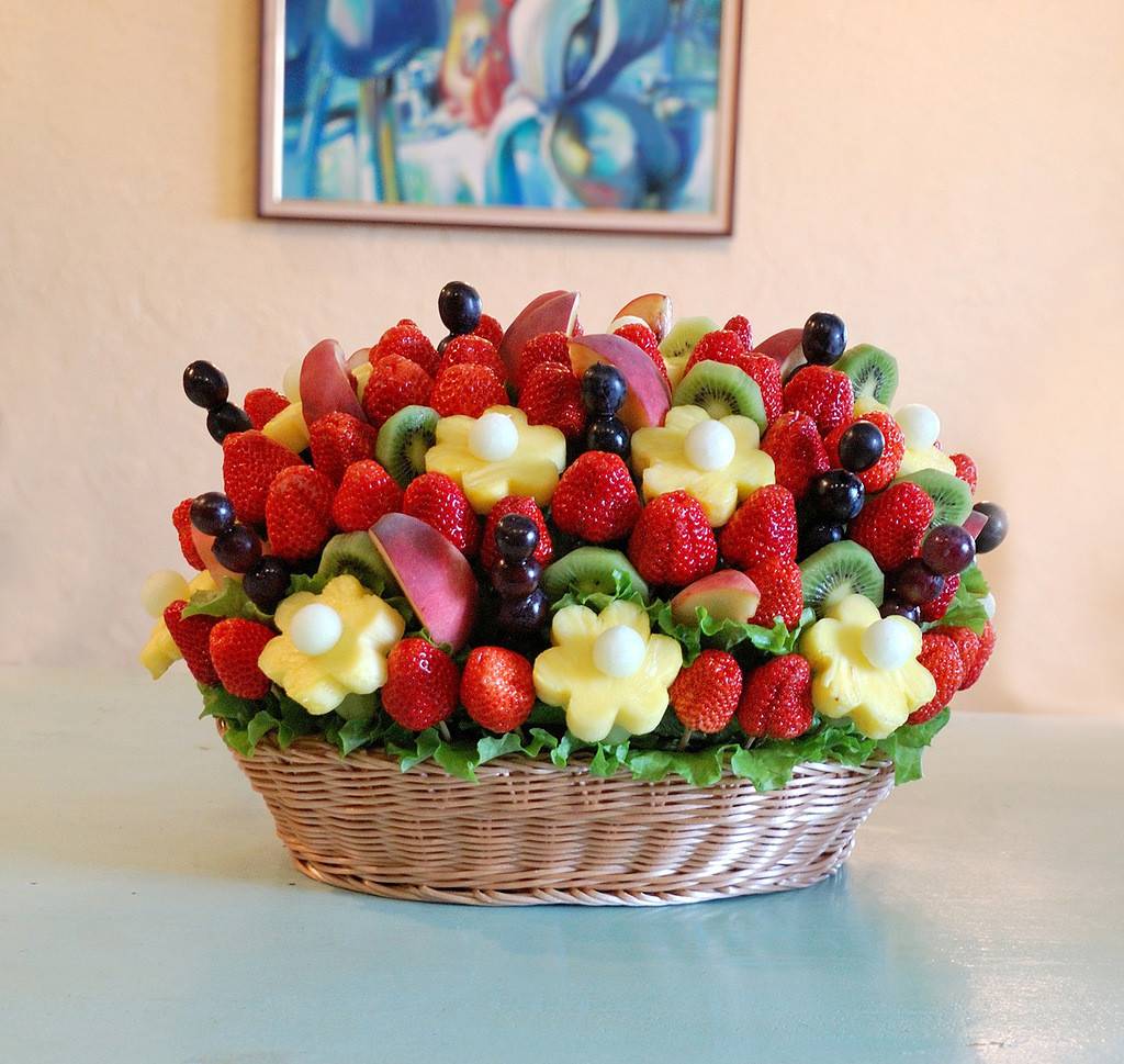 Если это фрукты и ягоды, то все они сверху покрыты слоем шоколада. Фигурки и цветы, украшающие произведение кондитеров, сделаны из белого и темного шоколада.