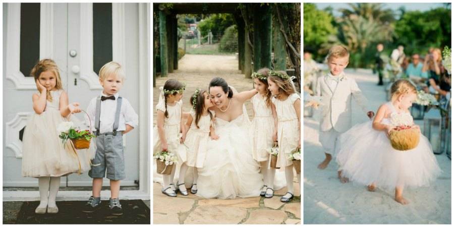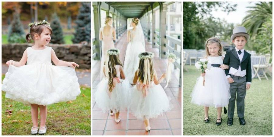 Мальчика, подносящего кольца, оденьте в смокинг с галстуком-бабочкой. Девочки должны чувствовать себя принцессами, поэтому пышные платья для них — обязательный атрибут. Здесь стоит помнить об одном моменте — одежда девочек должна гармонировать с платьем невесты.