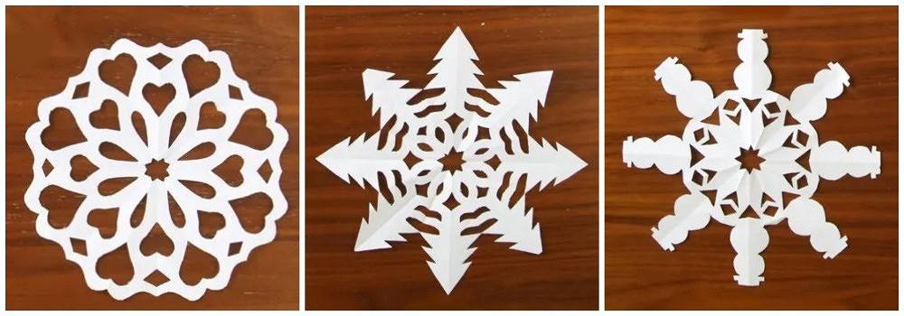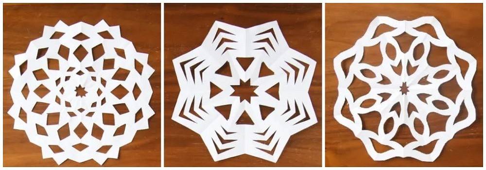 Хорошо подойдёт, например, офисная бумага или обёрточная бумага. Процесс не будет слишком простым, зато в результате у вас получатся настоящие снежные кружева! Получившимися снежинками вы с гордостью сможете украсить ёлку, окно, стены комнат. Также из них можно сделать красивые гирлянды. Ещё снежинки можно привязать за ниточки и подвесить к люстре, торшеру или бра.
