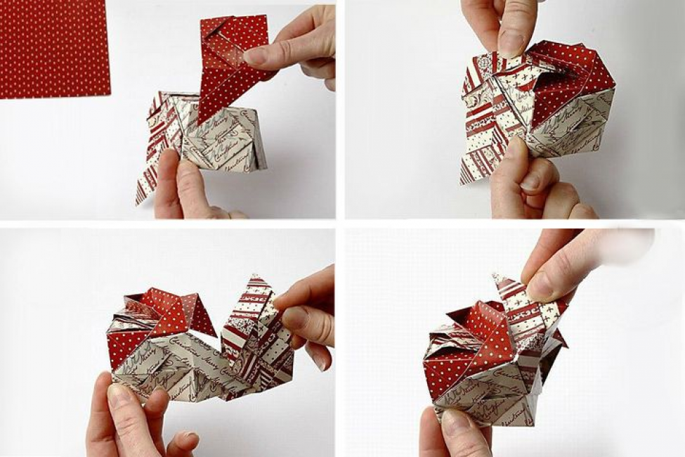 Далее открываем верхний подгиб, помещаем нижний треугольник в него, подвернув раскрытый край. Теперь все части фигурки одинаково выглядят.