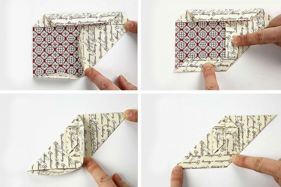 Нижний угол справа поднимаем до верхнего подгиба. Складку сбоку раскрываем, разглаживаем, направляем вправо.