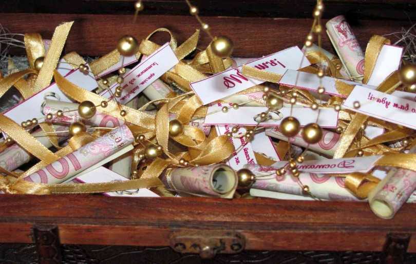 Для тематических, стилизованных свадеб карточка гостя может стать настоящим произведением дизайнерского искусства. Используйте все самое необычное: пробки от вина, значки, ракушки, кусочки дерева, камешки, фрукты, растения. Для украшение зала на золотую свадьбу отлично подойдут символические позолоченные элементы.