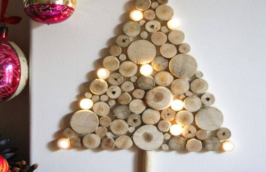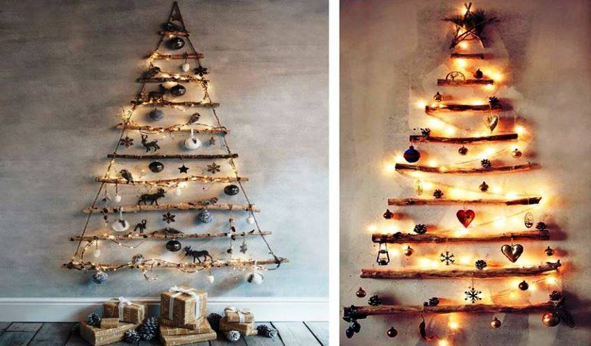 Для небольших пространств достаточно будет ёлочки на стене – она выглядит празднично и креативно. Её можно создать из разнообразных материалов: