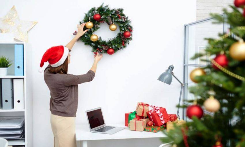 - Размер помещения. В зависимости от площади, декорирование кабинета можно разделить на несколько зон. Если площадь позволяет, в одном из свободных углов вы можете поставить даже небольшое новогоднее деревце. В небольших офисах лучше отдать предпочтение подвесному варианту — сделайте акцент на оформлении окон, стен или потолка.