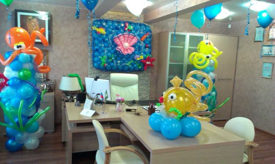 Дизайнеры советуют сделать в оформлении акцент на стеновых и потолочных поверхностях, поскольку напольные композиции могут мешать проходу. Цветовая гамма декора не должна быть яркой, чтобы не перегружать глаза сотрудников, украшения следует выбирать очень умеренно. Прекрасная идея украсить магнитную доску поздравительными надписями.