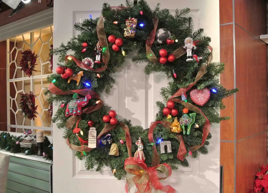 Рождественские веночки прочно входят в новогоднее украшение офисов. Можно сделать их своими руками из абсолютно любых материалов, для этого потребуется предварительно подготовить основу из пенопласта или газет и украсить интересным декором. Такая композиция при бережном отношении прослужит многие годы, а закрепить её можно не только на дверях и стенах, но и потолке, или просто поставить на рабочий стол.