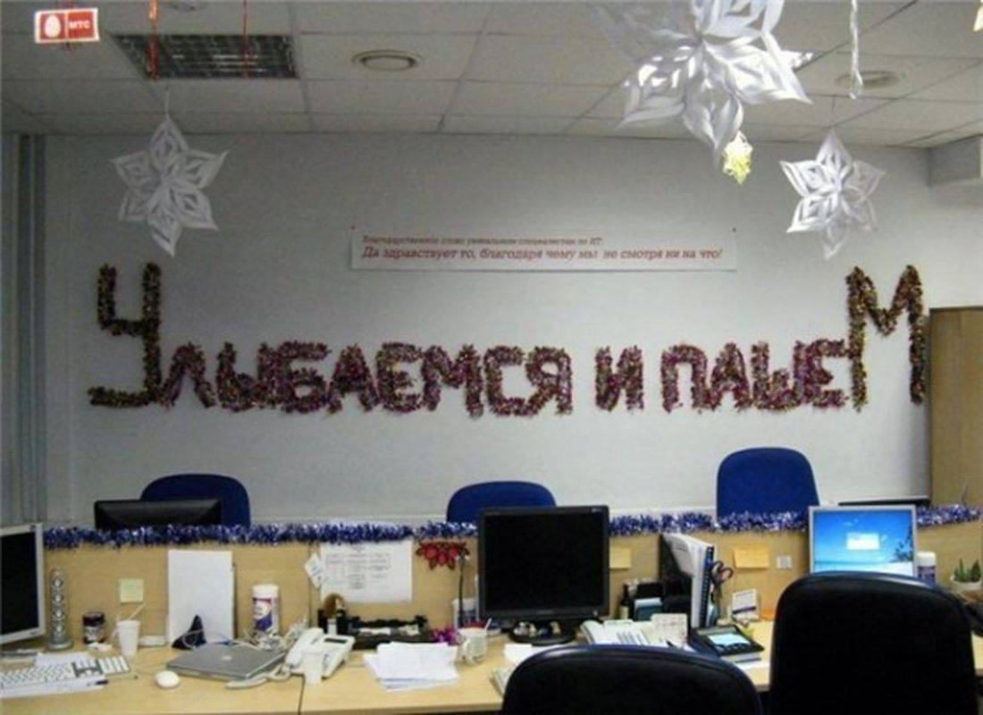 Интересно смотрятся варианты из новогодних открыток, канцелярских скрепок. На магнитной доске закрепите мини-послания от деда мороза или фото сотрудников – лучше праздничные, новогодние, смешные. Поищите в архиве с прошлогоднего корпоратива.