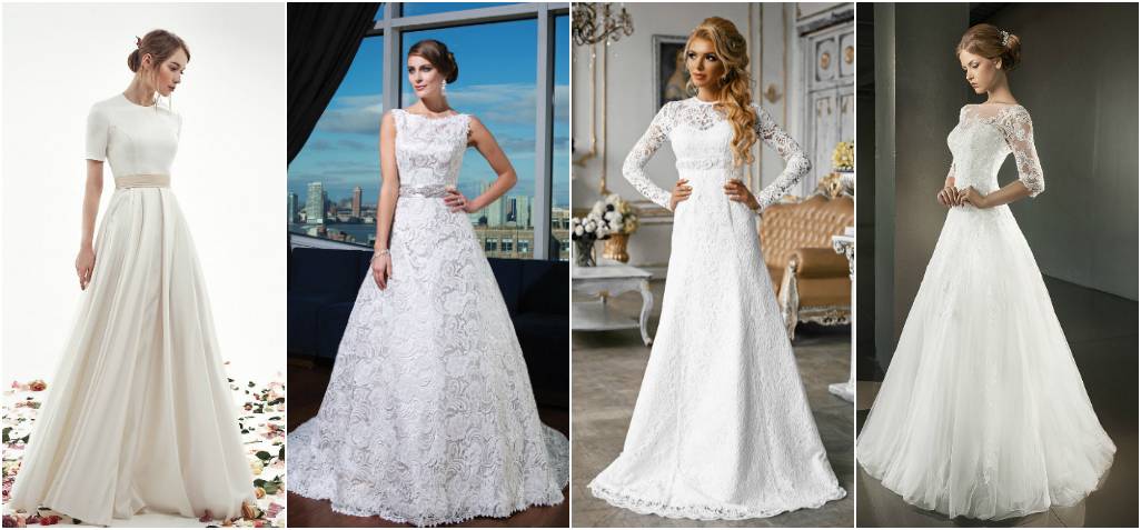 Как я уже говорила, скромное платье на свадьбу не предполагает определённого фасона. Но есть наиболее подходящие для этого модели.