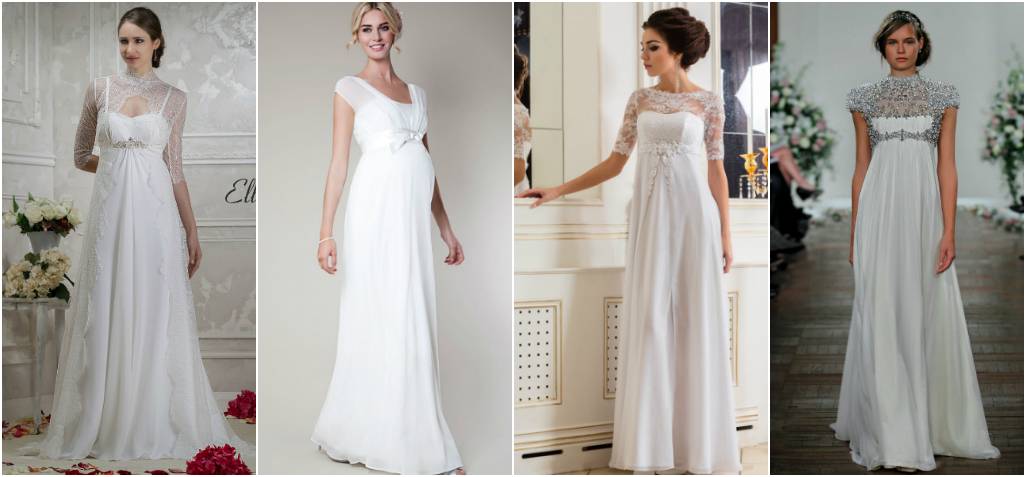 Такой фасон подходит и беременным невестам. Если Вам приглянулась традиционная модель без рукавов или на тонких бретельках, её можно дополнить болеро.