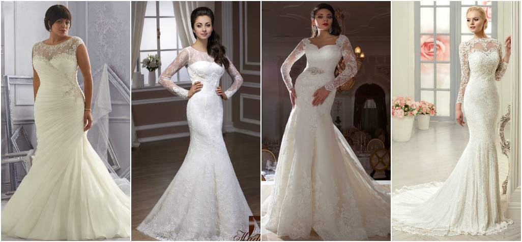 Если невеста невысокого роста, то лучше выбирать среди вариантов со шлейфом, который визуально вытягивает фигуру. А если такой наряд дополнить длинным рукавом, то Ваш образ станет ещё более скромным и невинным.