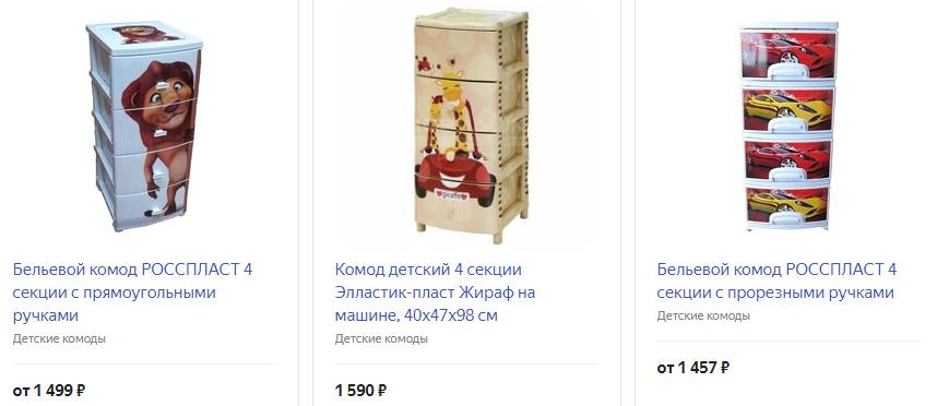 Детский комод. Он нужен для детских вещей и одежды. Но его дизайн, цвет и фасады не должны быть скучными. Поэтому подойдет пластиковый комод с выдвижными ящичками и яркими рисунками. Стоимость от 1200 рублей.