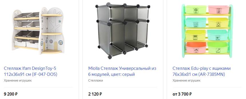 Стеллаж для игрушек. Расставляя игрушки по своим местам, ребенок приучится к порядку. Да и комната с такой мебелью заиграет яркими красками. Стеллаж лучше всего выбрать пластиковый с глубокими контейнерами. Цена около 4000 рублей.