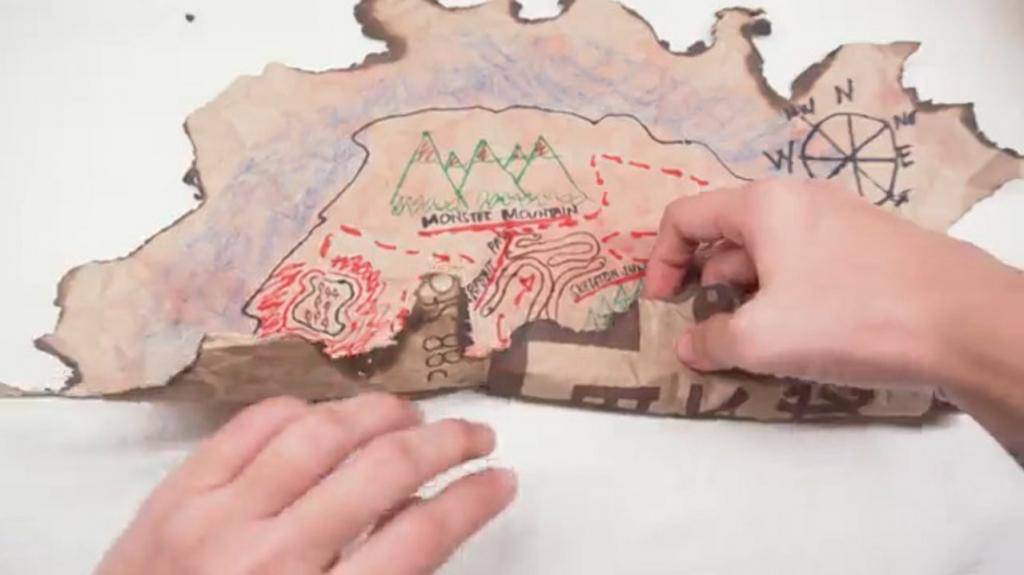 Чтобы сделать правдоподобную карту можно засунуть лист бумаги в духовку – там он покоричневеет, или пропитать лист чаем и высушить на батарее. Затем слегка оборвать и обжечь углы, можно помять немного листок. Потом взять фломастеры и нарисовать карту местности, это может быть и квартира или в площадка у дома. Естественно при рисовании карты стоит отталкиваться от возраста детей – маленькие дети не думаю что смогут разобраться в тайнах картографии или прочитать что там написано, тут либо в помощь придет мама, либо надо рисовать доступно для детей))))