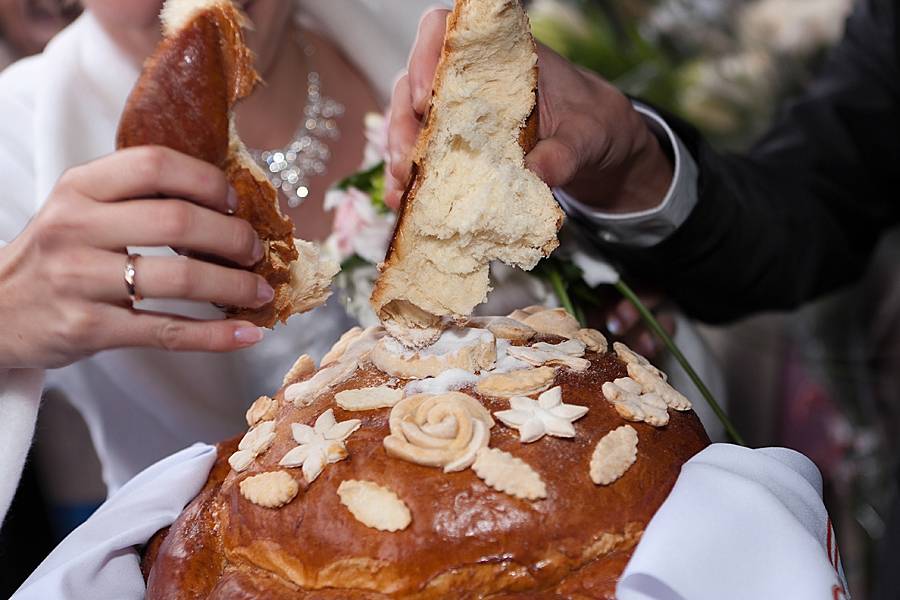В любом случае каравай – это красивый и вкусный хлеб, вручную сделанный счастливой в браке женщиной, которая при замесе теста должна читать молитвы «Отче наш» и «Богородице». Бывает, что каравай делают трехслойным, где верхний слой отдают молодым, средний делят между гостями, а нижний (в который к тому же запекают монеты) – свадебным музыкантам. Но чаще всего эту часть обряда сильно упрощают.