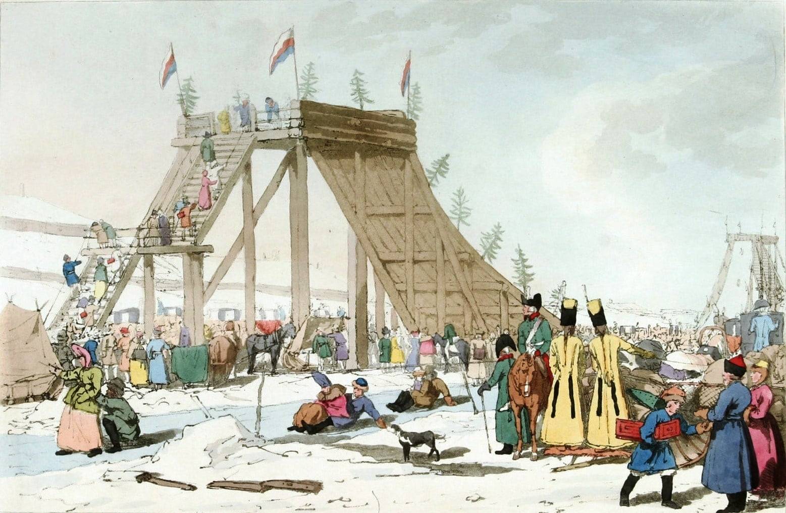 Литератор П.Свиньин, современник Пушкина, пишет: «Народ катается с гор на лубках, ледянках и на санях, а кто не умеет управлять оными, тот садится в них с катальщиком, который наблюдает, чтобы сани держались в прямой линии. Нельзя ни с чем сравнить удовольствия, когда видишь себя перелетающим в одно мгновение ока 40 или 50 саженей — это кажется очарованием!.. Ввечеру горы освещаются фонарями; отражение сей массы разноцветных огней в снегу, мешаясь с тенями, представляет необыкновенное зрелище не только для иностранца, но для самого русского: это совершенная фантасмагория!»