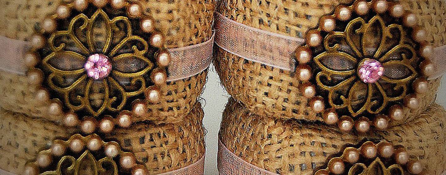 Большой простор для фантазии представляет вариант узора из страз. За основу берётся втулка от бумажных полотенец, разрезанная на браслеты одинаковой высоты. Лентой белого или пастельного тона наматывается нижний слой, следом делается перетяжка более ярким цветом по тону сервировки. При помощи клеевого пистолета наносится творческий узор из набора страз.