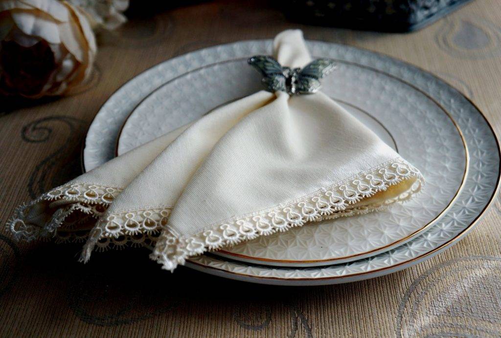 Свернутую в трубочку салфетку можно украсить полоской вязаного кружева, так же как и тканью. При этом не обязательно выполнять застежку на пуговицы, ведь вязаное полотно легко тянется.