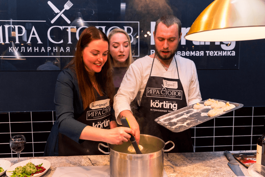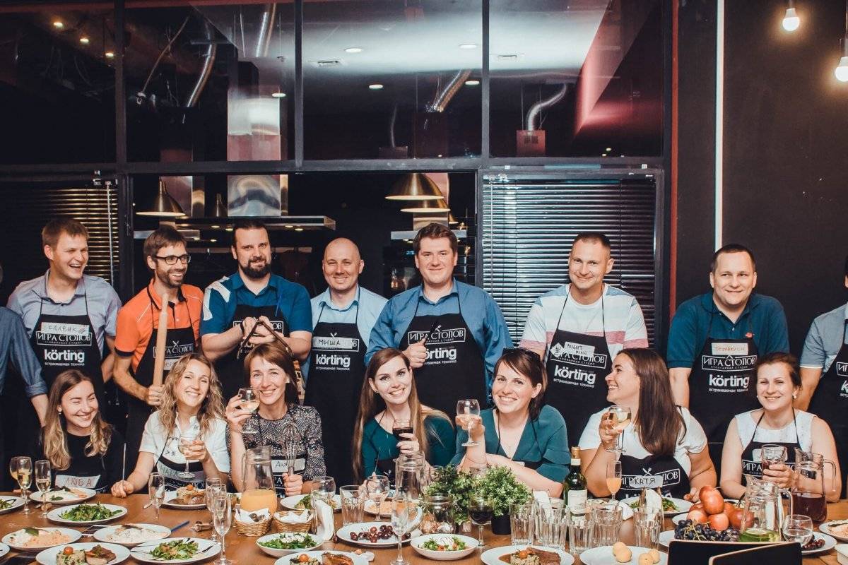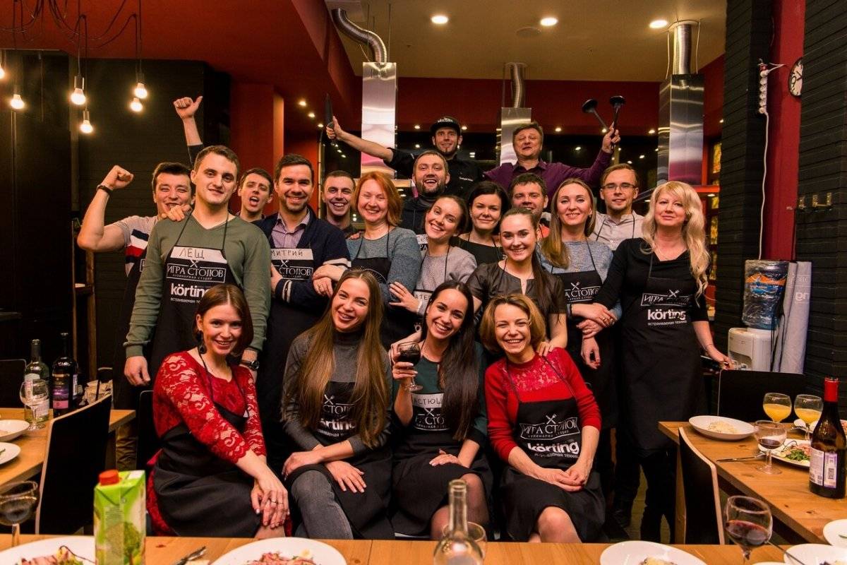 - Разделившись на команды, участники кулинарного тимбилдинга готовят три блюда, которые потом войдут в меню общего праздничного ужина.