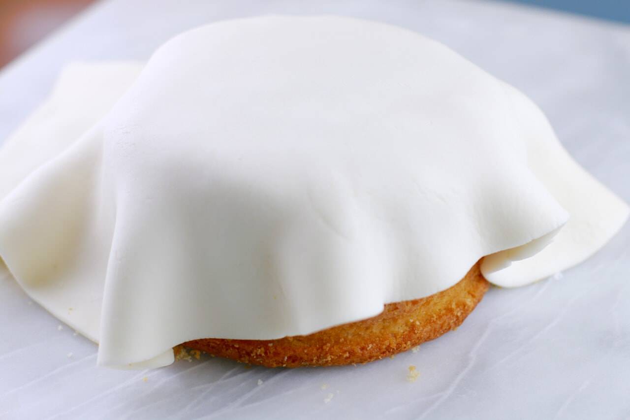 Мастика из маршмеллоу делается из жевательного зефира (топится в СВЧ-печи), сливочного масла, сахарной пудры, воды и лимонной кислоты (по вкусу). Для придания цвета добавляют соответствующие красители. Полученную массу раскатывают в лепешку и аккуратно покрывают основу из коржей.