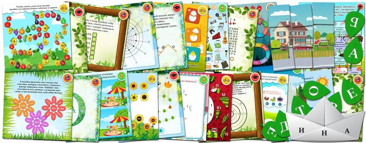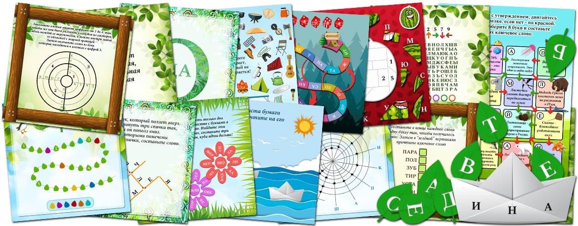 Все задания из наших комплектов: сценарий квеста на природе, сценарий квеста на улице, сценарий квеста на даче, – профессионально и красочно оформлены с весенне-летнем стиле.