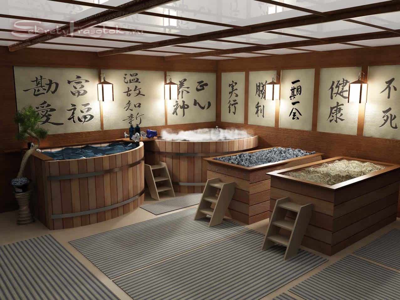 В Японии парилки делятся на 2 типа: индивидуальная (офуро) и для массового помещения (сэнто). Первая внешне похожа на бочку: температура воды в ней достигает +50 градусов Цельсия, влажность – до 30%.
