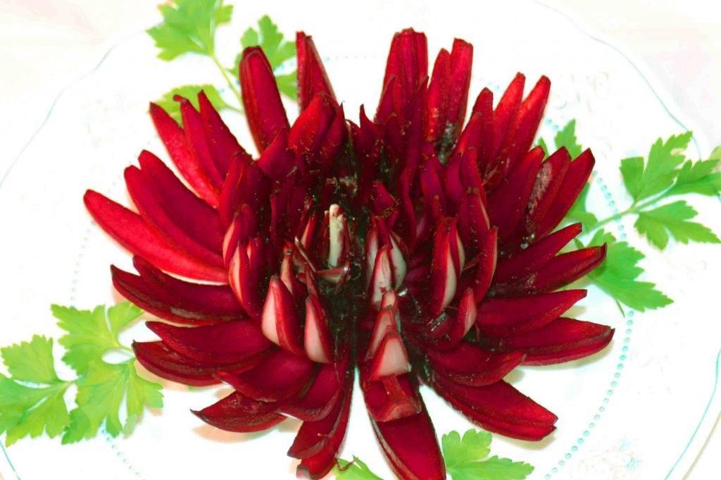 Вариант оформления с нежными цветами которые сделаны из редьки нарезанной тонкими слайсами. Как видите в тарелке использованы охотничьи колбаски нарезанные кусочками.