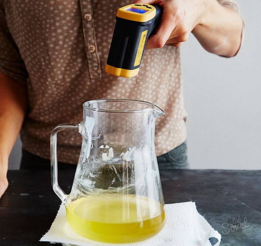 Немного остудите парафин. Идеальная температура заливки — 87-90°С. Температуру измеряйте с помощью термометра.