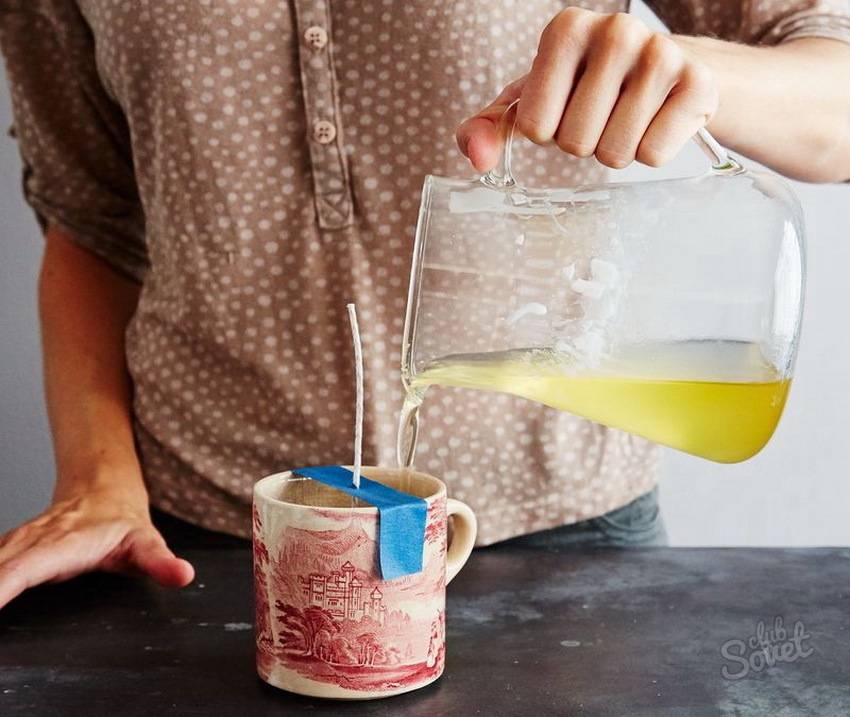 Как только сформируется однородная субстанция, внутрь необходимо окунуть нитку, формирующую фитиль. Нить должна быть не простой, а состоящей из множества скрученных между собой отдельных ниточек. Далее фитиль необходимо зафиксировать в выбранной форме, чему поможет обычная зубочистка.