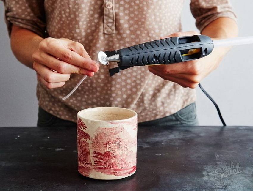 Пока восковая масса остывает, установите фитиль. Его основание зафиксируйте горячим клеем на дне формы. Так во время застывания воска он не сместится.