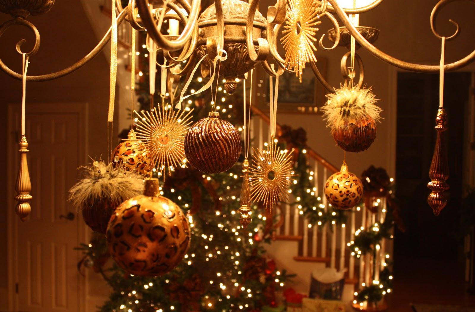 Веточки ели отлично будут смотреться на люстре.Все игрушки, которые подвешивают под потолком, должны держаться очень прочно — это вопрос безопасности тех, кто проходит под таким навесом.Перья из подушки сделают образ люстры волшебным, и нужно дополнить его свисающими ёлочными игрушками.Ёлочные шары сразу превращают люстру в нечто яркое и красивое.