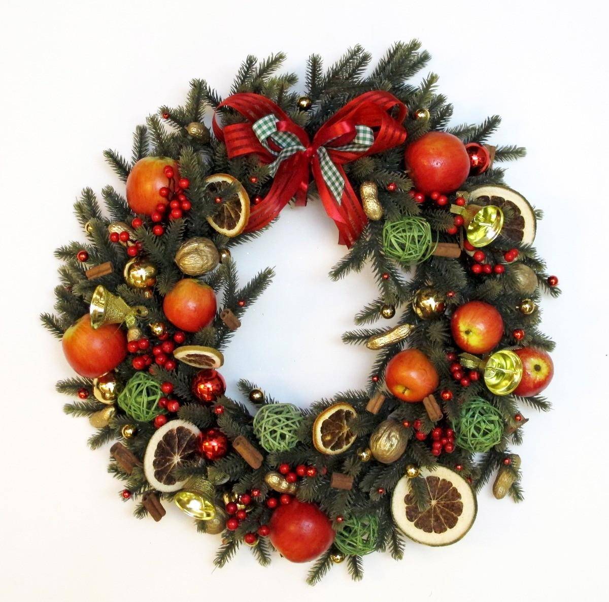 Ключевые элементы для декора венка: сушеные ломтики цитрусов, шишки, зимние ягоды, бутоны цветков, пробки, бусы, ленты, банты, мишура и гирлянды. Венок можно расположить не только на стене или двери, а еще и украсит им люстру, окно, мебель, камин.