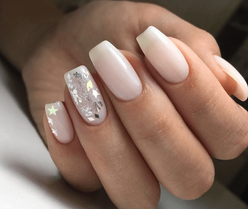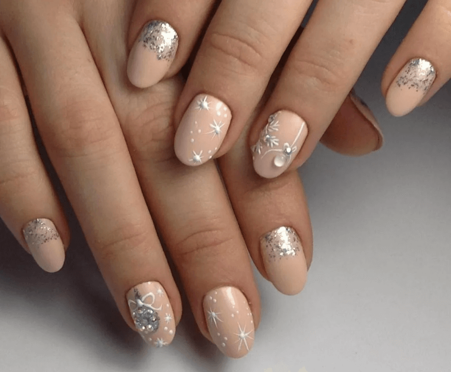 Также, очень празднично и нежно будут смотреться нюдовые ноготки с блестками и рисунками.