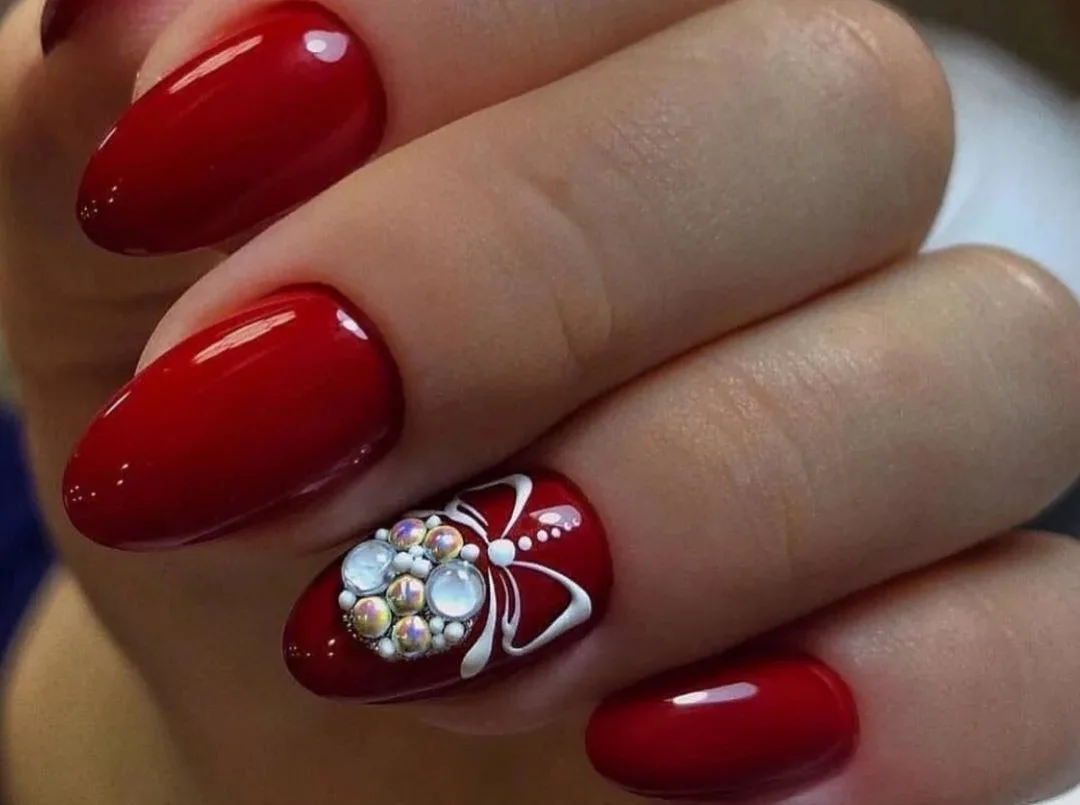 Исполнить эту идею перед праздником можно и в другой цветовой гамме, но учитывая важное модное правило — не стоит злоупотреблять столь броской деталью. Желательно располагать ее только на нескольких ногтях