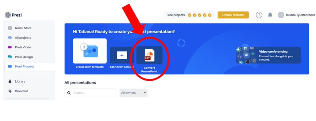 Интересно, что ресурс позволяет обрабатывать презентации, созданные в PowerPoint. Для этого достаточно загрузить презентацию из в PowerPoint в Prezi (для этого в Prezi Present нужно выбрать Convert PowerPoint) и выбрать дизайн.