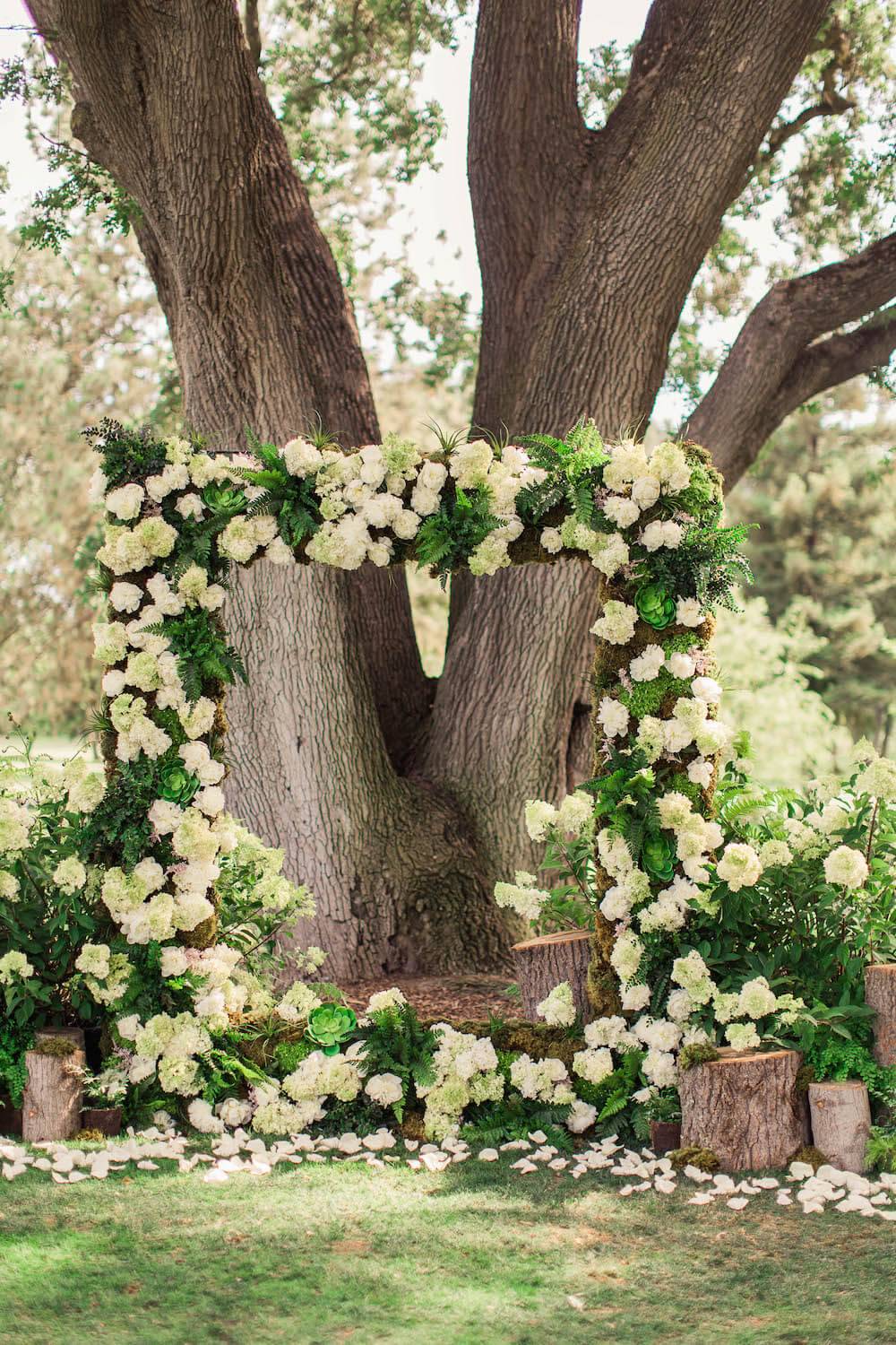 В оформлении лесной свадьбы декораторы часто используют большое количество живых и искусственных цветов.
