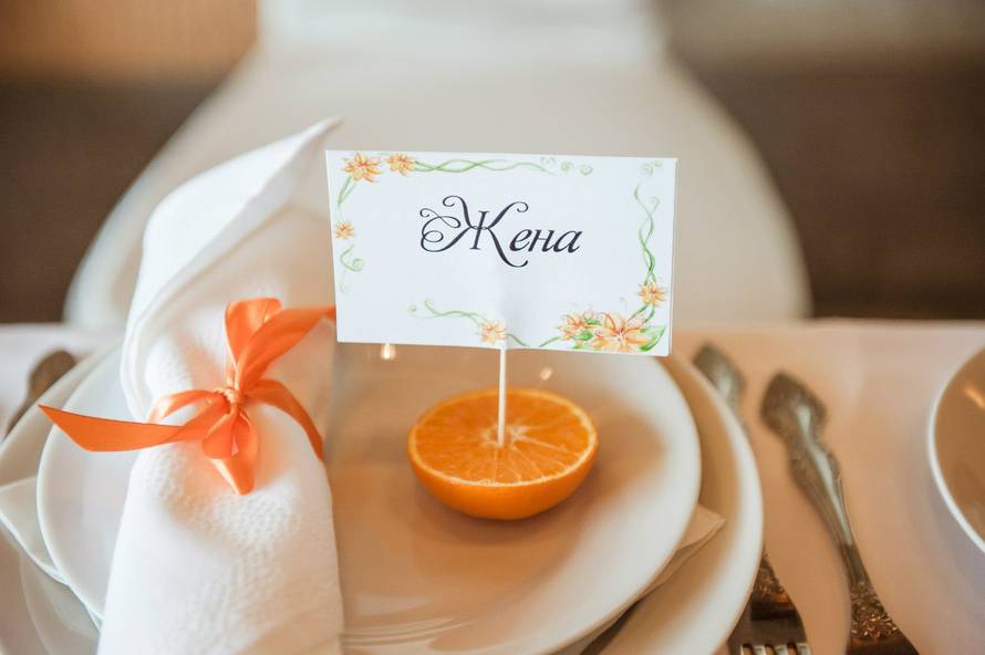 Не забудьте про главные атрибуты зимы – апельсины и мандарины. Их можно украсить, а еще неплохо использовать цитрусовые в качестве подставок под таблички с именами приглашенных.