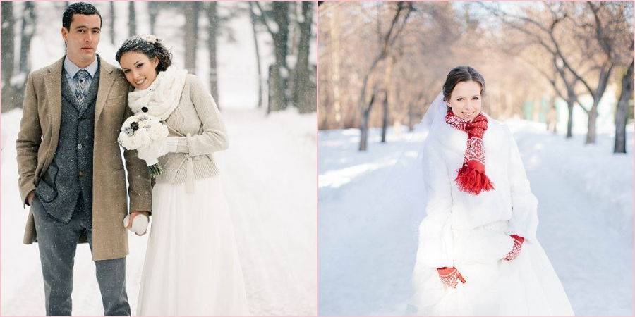 Яркие образы в это время года смотрятся максимально уместно. Возможно, невеста не хочет быть в белом. За нее все сделала природа, ведь зимой светлых оттенков и так достаточно! Яркий, нарядный образ, дополненный правильной обувью и аксессуарами, вам можно все! Абсолютно любые оттенки для свадебного наряда, короткое платье и отсутствие фаты – оригинальный и вполне приемлемый для зимы вариант.Невесте, которая предпочитает оставаться верной традициям, тоже повезло. Заморозки и плотный снежный покров позволяют надеть платье в пол или даже со шлейфом без страха испачкать прекрасное творение дизайнеров. Длинная традиционная фата также будет смотреться уместно.