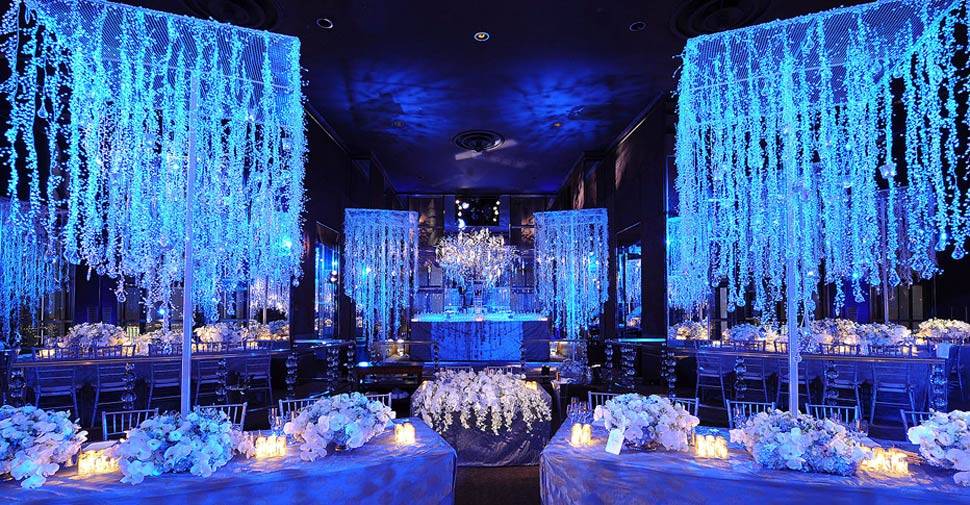 Подчеркнуть тематику можно с помощью хрустальных люстр, стеклянной посуды и серебристых столовых приборов.