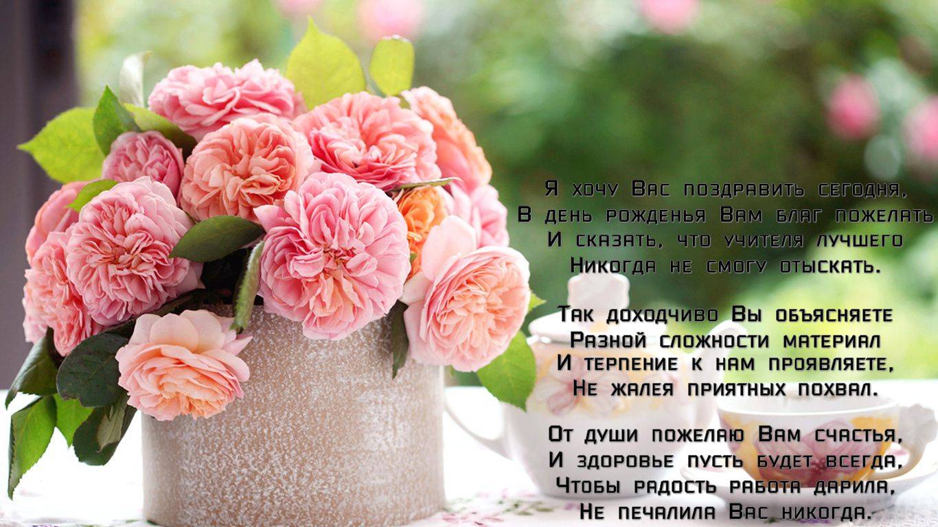 Учитель, Вас сегодня поздравляем, Подарки дарим и цветы, Примите их в знак уважения И доказательства любви. Вы наш учитель и наставник, И мы желаем счастья вам. Сегодня в праздник День рождения, Здоровья пожелаем Вам. Пусть ваши дети будут рядом, Работа будет Вам родной, Терпенья много Вам и силы, Вы наш учитель дорогой!