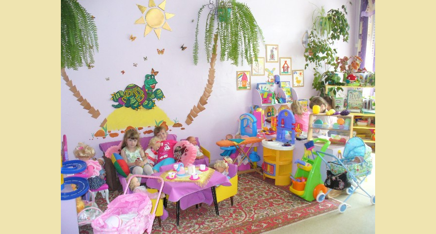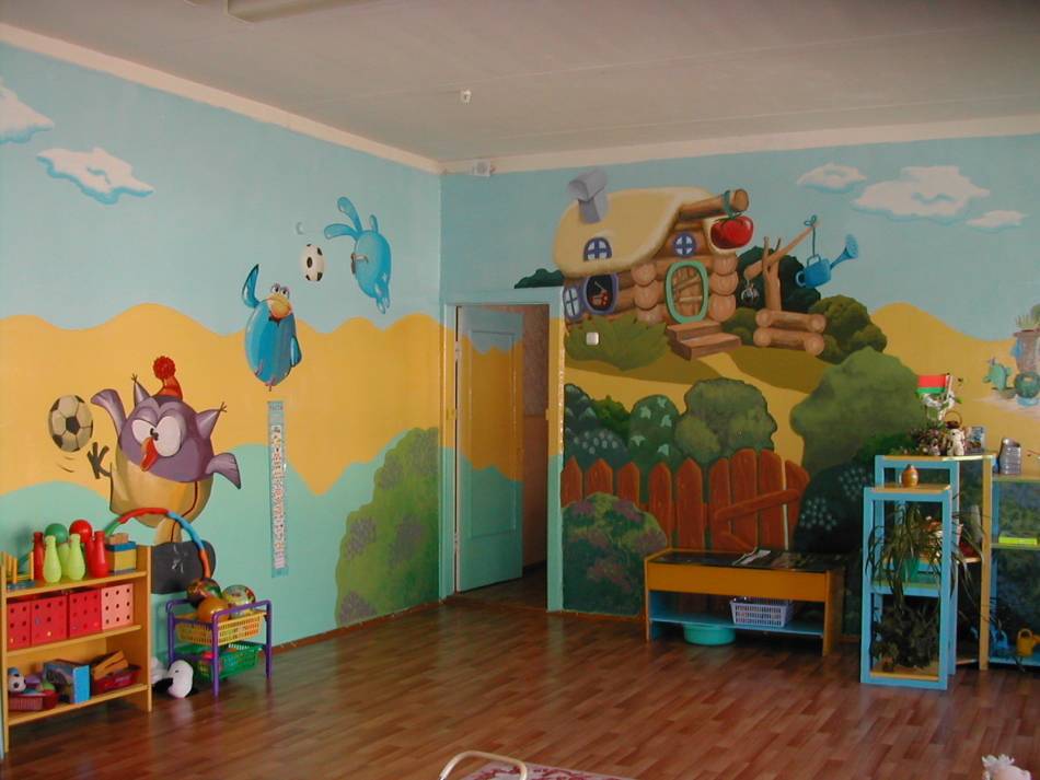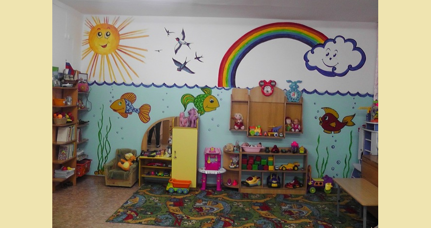 Мультяшное оформление ясельной группы. Летняя тематика, сказочные герои, мультипликационный сюжет — все это понравится любому малышу от 1,5 лет. Естественно, так раскрасить стены смогут либо сами воспитатели, либо творческие родители.