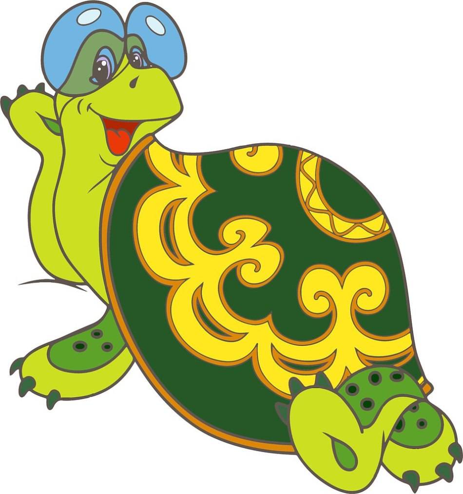Вот шаблон черепахи ко второму варианту оформления интерьера. Она отлично устроится на холме, между пальмами, и будет радовать своим веселым внешним видом. Просто распечатайте ее на цветном принтере на бумаге нужного размера и приклейте на стену.