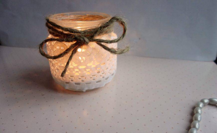 Электрическая свеча приклеивается к крышке банки, крышка закручивается на банке, и взору предстает стильный светильник.