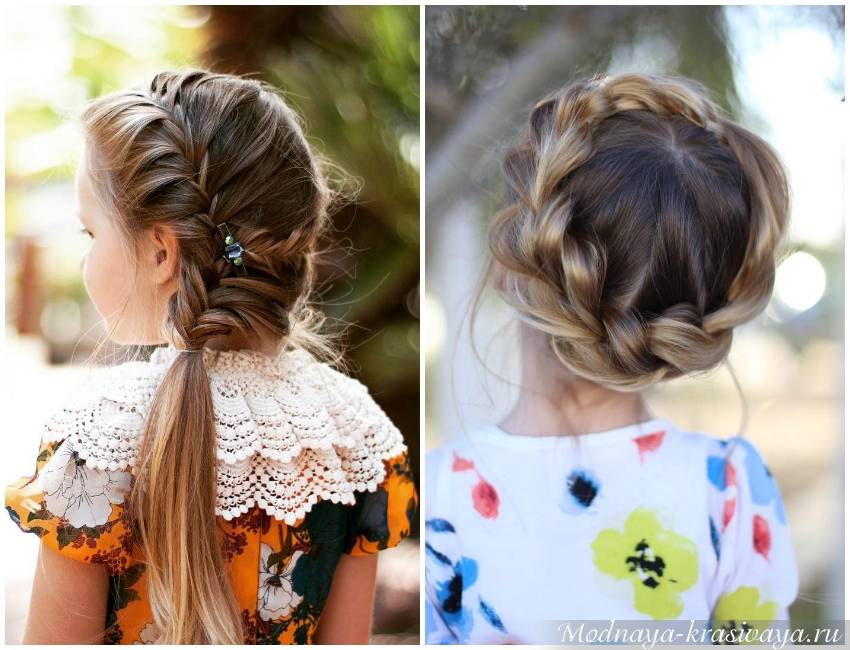 Здесь можно экспериментировать и выбирать любой вариант. Хорошо выглядит боковая французская коса наоборот, в которую можно вплести ленту или же дополнить ее бантом. Можно сделать косу и с помощью резиночек. Или остановить свой выбор на обычной косичке с бантами, заколками.
