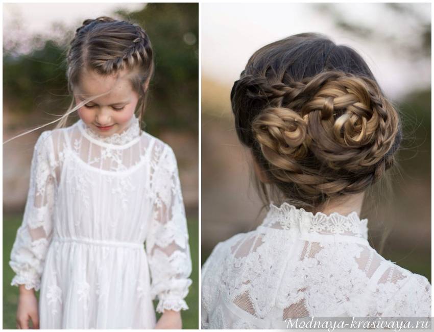 А вот в такой особенный праздник, рекомендуем сделать косичку по всей голове в виде короны, косу «Водопад» с локонами, рыбий хвост на макушке, объемную мальвинку, бант из волос или греческую укладку.