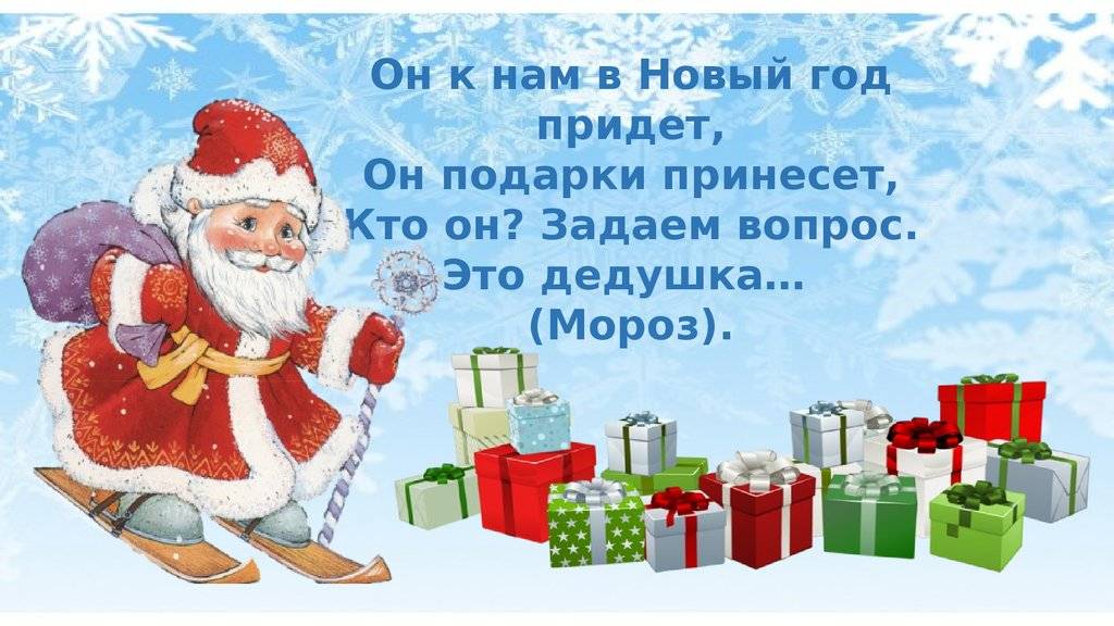 Кто с огромнейшим мешком, Через лес идет пешком… Может это Людоед? Нет. Кто сегодня встал чуть свет И несет мешок конфет… Может, это ваш Сосед? Нет. Кто приходит в Новый год И на елке свет зажжет? Включит нам электрик свет? Нет. Кто же это? Вот вопрос! Ну, конечно… (Дед Мороз.)
