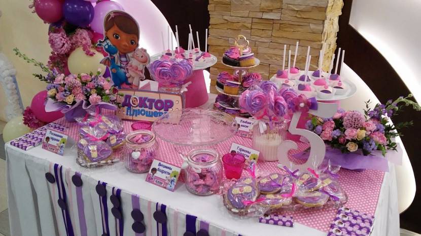 Для дней рождения лучше заказать цифры-возраст, которые можно приклеить к палочкам и украсить ими вазы с конфетами и шоколадом. Декорируйте стол ветками из фруктов, цветочными букетами из леденцов и даже любимыми игрушками именинника. Например, в качестве тарелки для сладостей может служить кузов грузовика, а в телеге можно разложить канапе из фруктов. Не бойтесь экспериментировать, любое нестандартное решение будет восприниматься детьми с восторгом и удивлением.