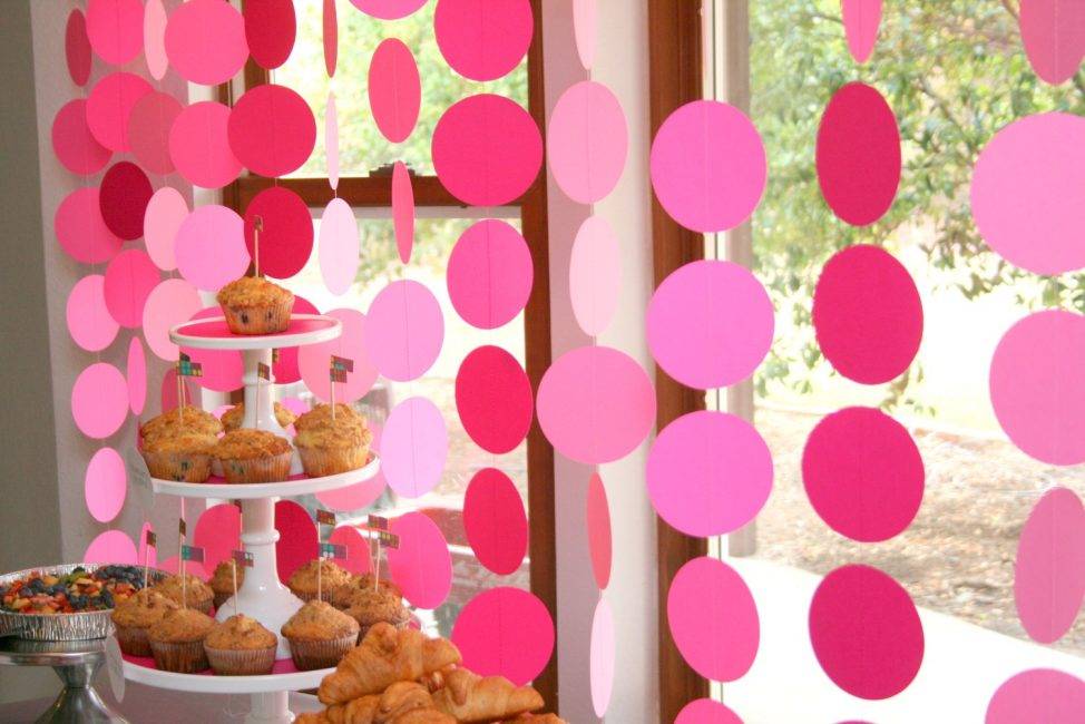 Вырезаем руками кружочки из бумаги ножницами или создаем их при помощи фигурного дырокола. Также можно использовать машинку для тиснения со специальным ножом. Сшиваем кружочки на швейной машинке один за другим в длину. Вот так очень быстро делается гирлянда своими руками на День Рождения. Ее можно подвесить длинными рядами на окне или растянуть на стене.