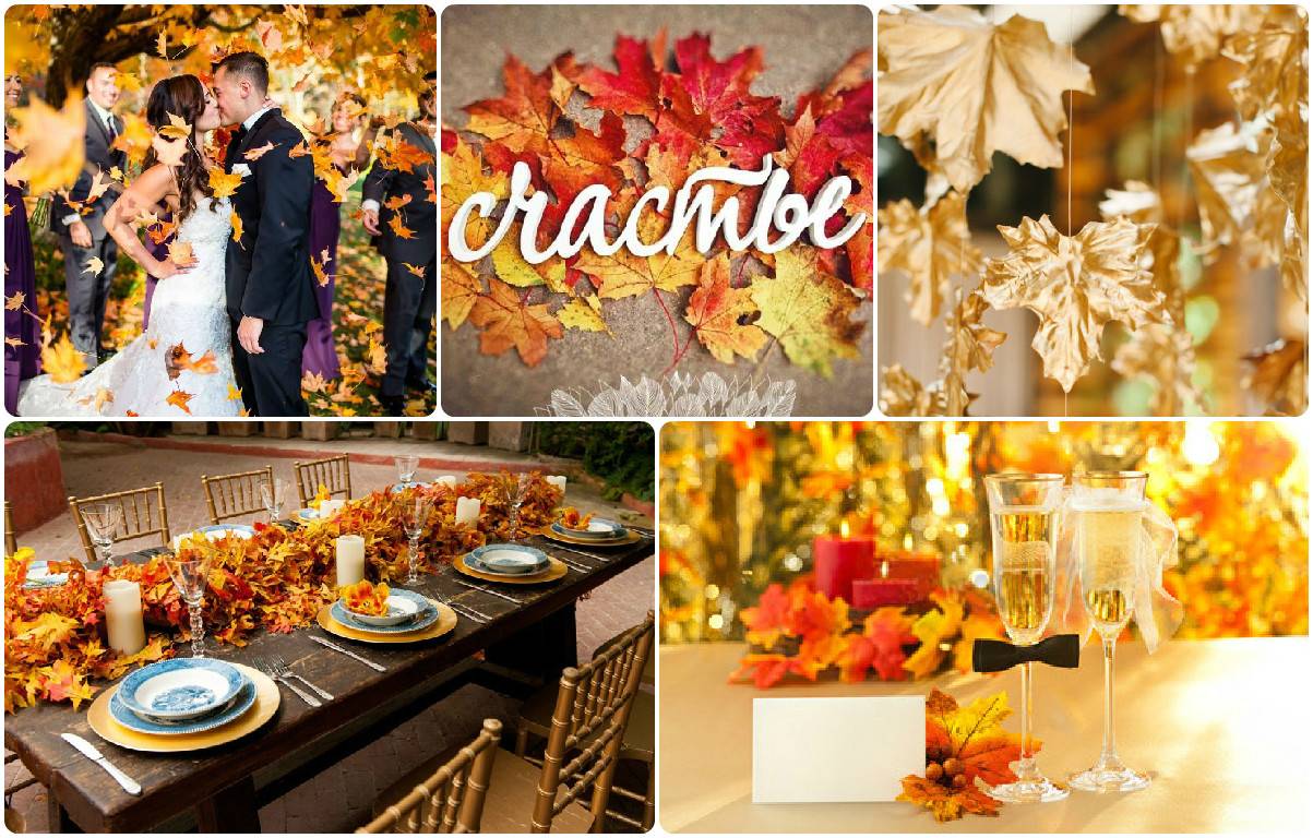 Украсить помещение на осеннюю свадьбу можно при помощи кленовых листьев различных оттенков — желтого, багряного, бордового, коричневого. В качестве декора также понадобятся летящие ткани, ленты, бумажные шары и гирлянды, китайские фонарики.